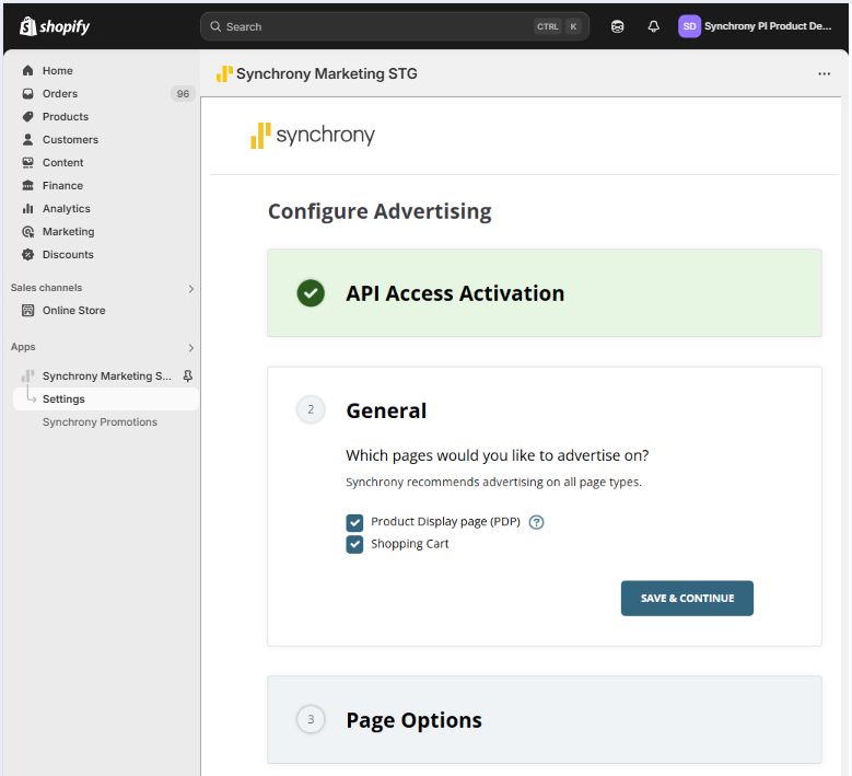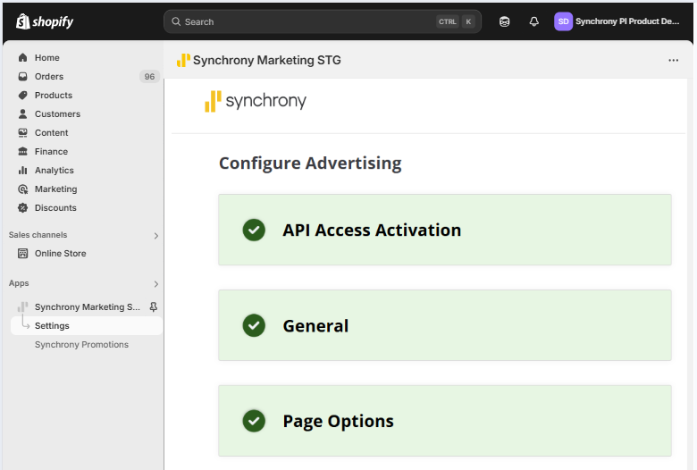 - Proceed to the Synchrony App Settings page by using the left-side navigation or Shopify search field (Left Navigation > Apps > Synchrony Marketing App).