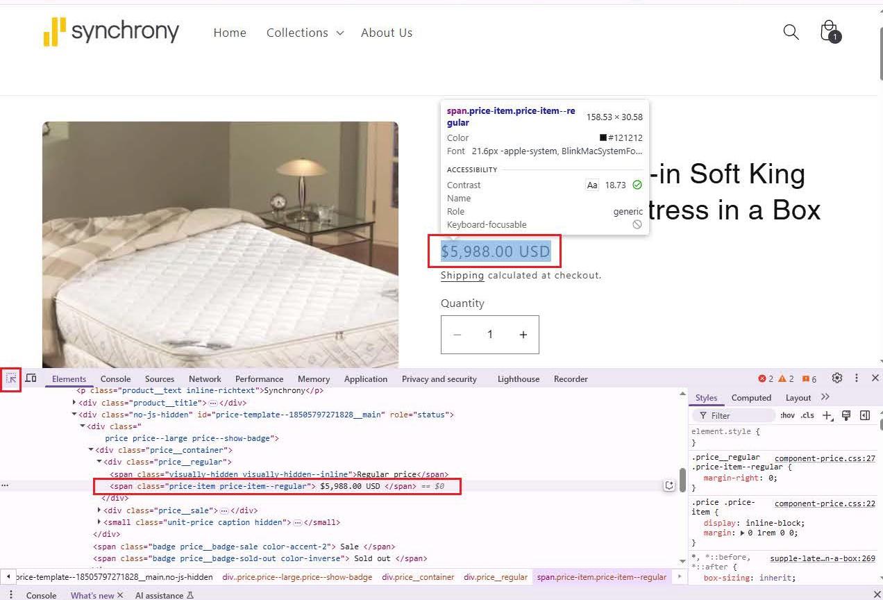 - Hover over the price section of the page. It will highlight in blue. This will take your console directly to the corresponding element in the code