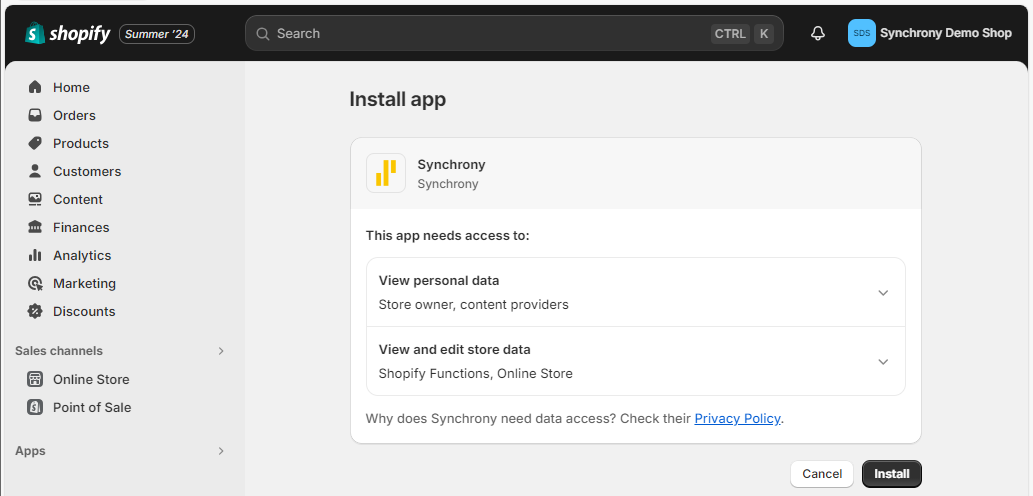 The Install page will display in your Shopify Admin Console.