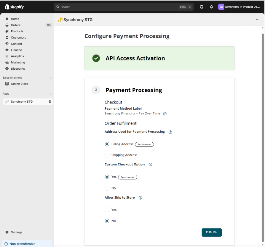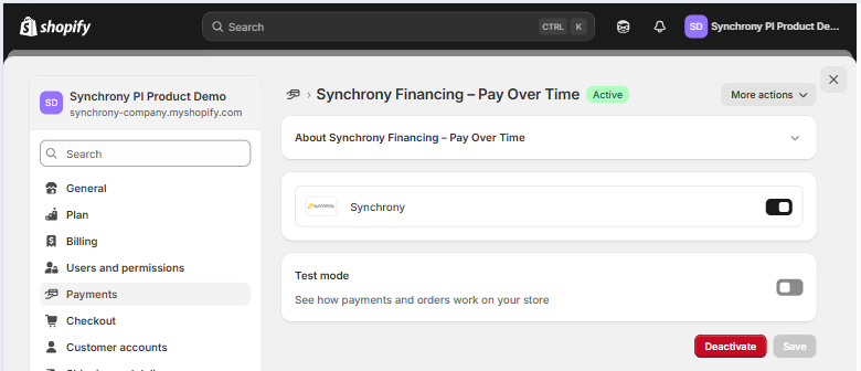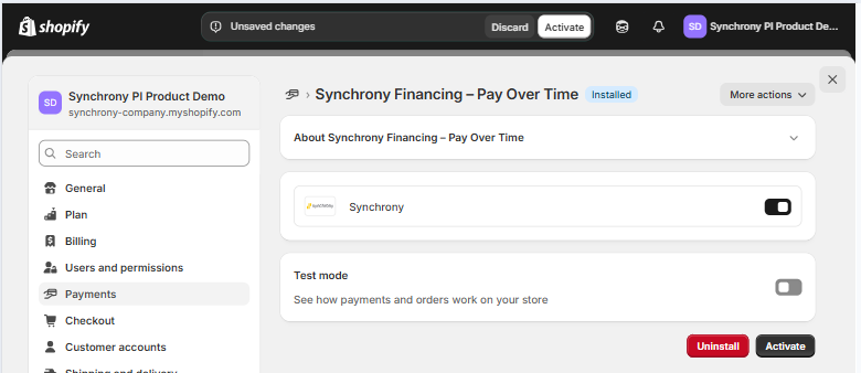 - To confirm set up - toggle off 'test mode' and click Activate. You will see "Active" next to “Synchrony Financing – Pay Over Time".