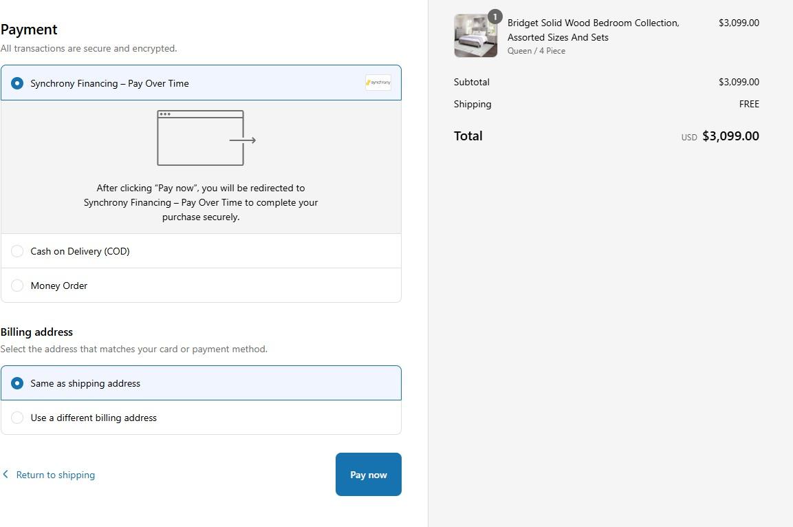 - Add a sample item to the cart and go to checkout. You should see the Synchrony Financing Pay Over Time option. This verifies it is set up correctly.
