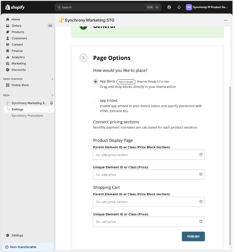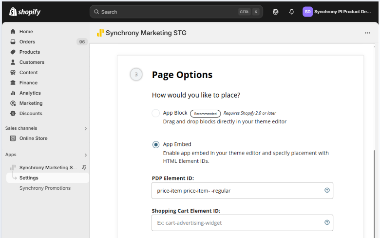 To configure the Synchrony Promotional Financing message with App Embeds, navigate back to the Synchrony Marketing App configuration page.