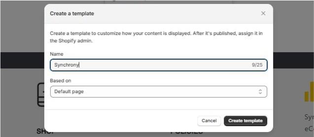 - Name the new template “Synchrony”, Based on Default page, and select Create Template.