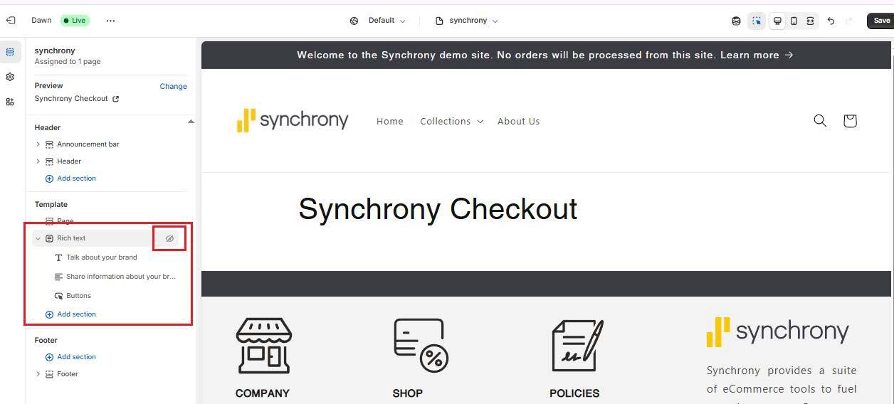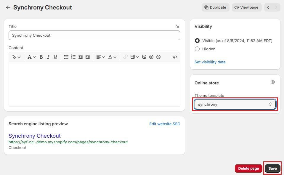 - On the Synchrony Checkout page editor, change the Theme template to the Synchrony template you created in the steps above and click Save.